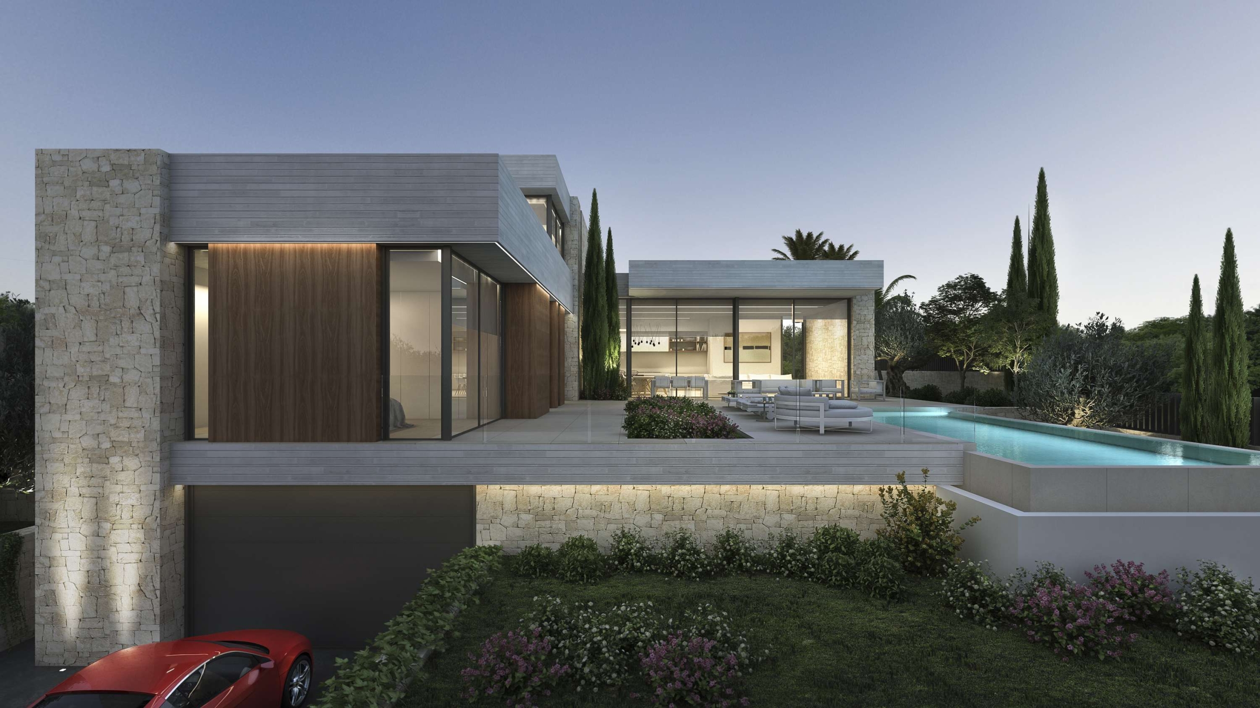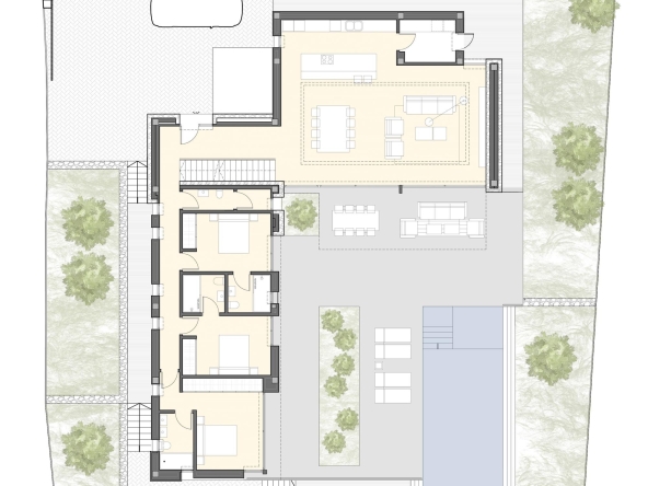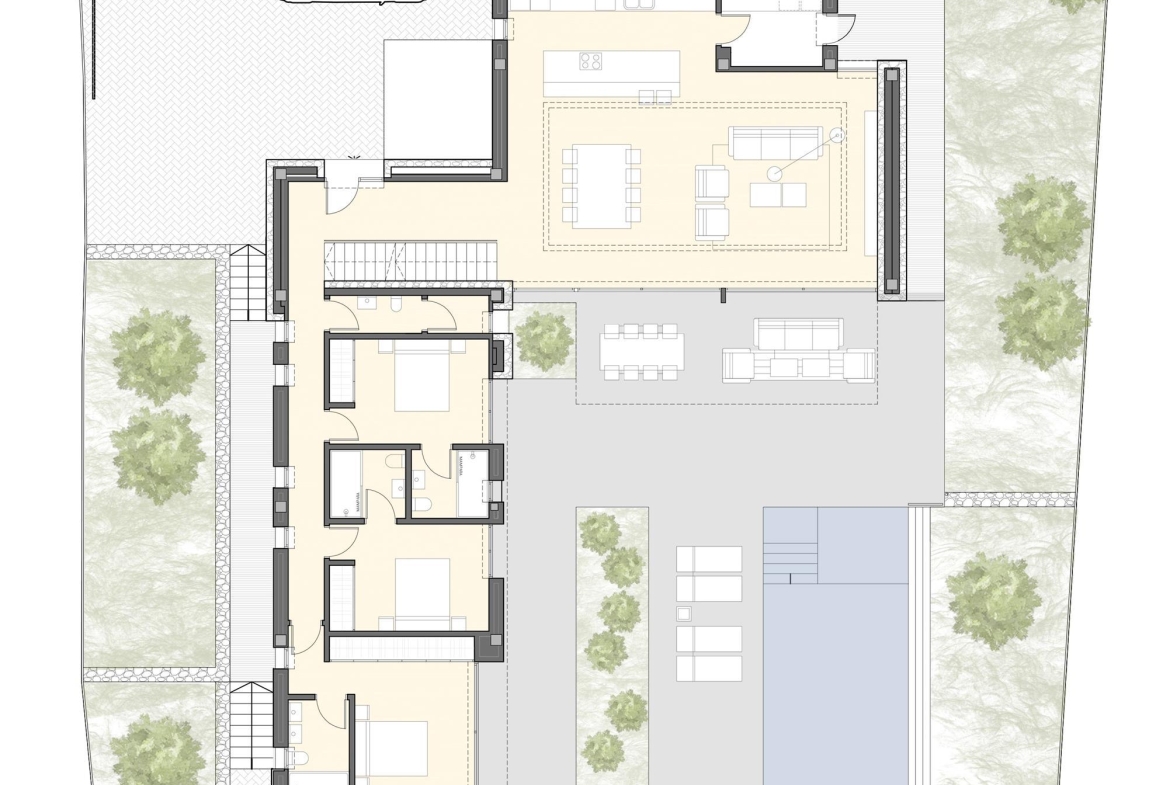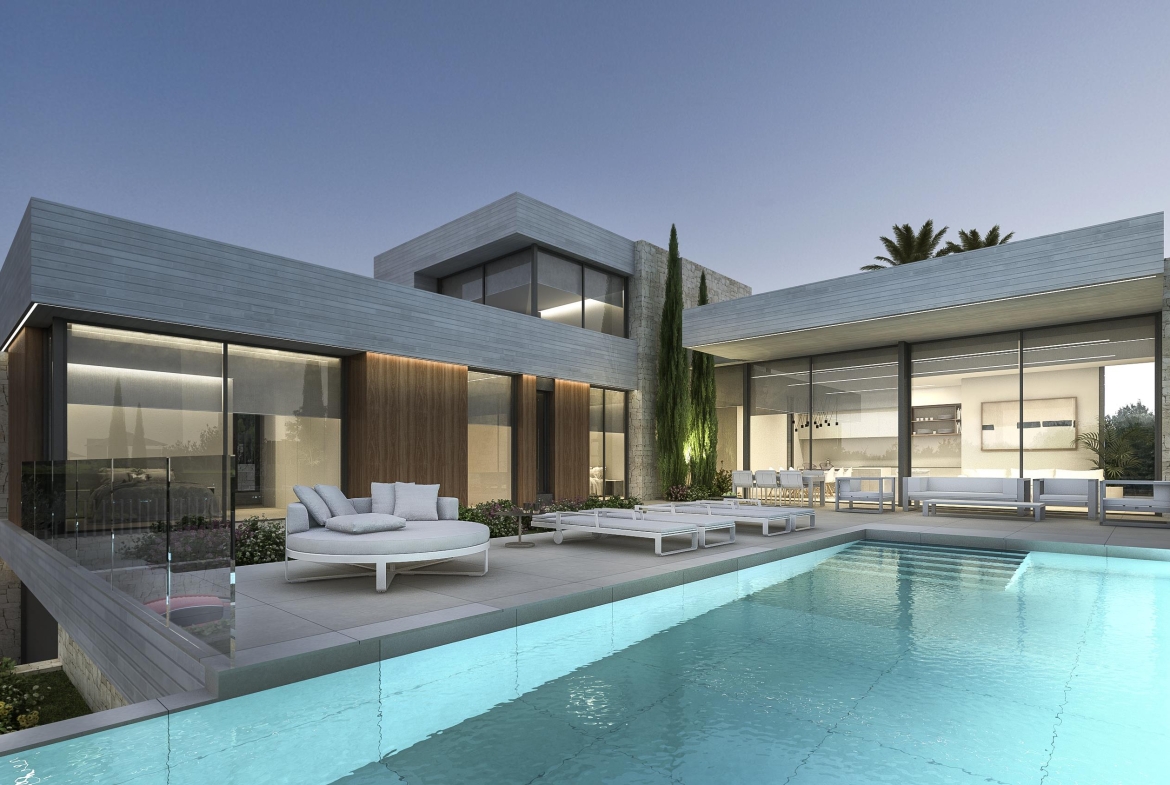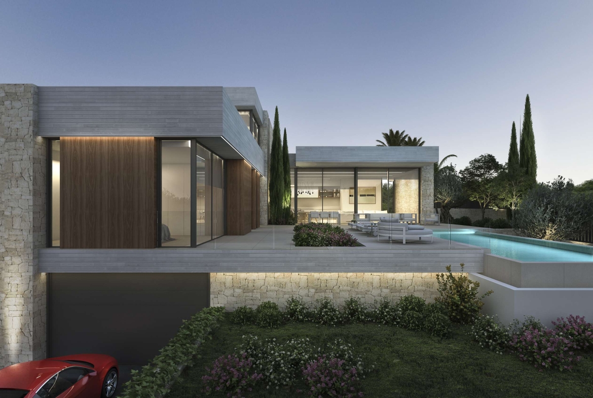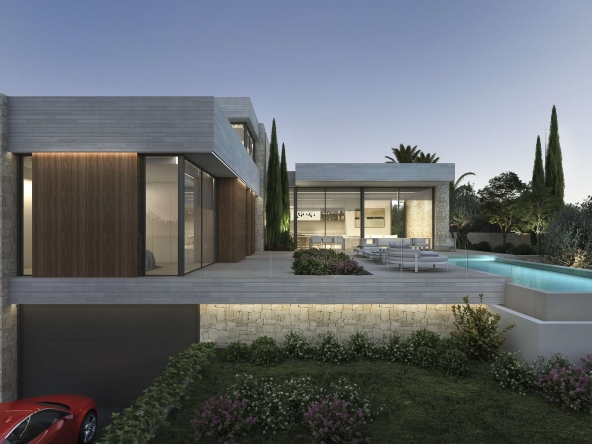 Project for a magnificent modern Villa of 358.06 m² construction, plus 153.20 m² open terraces, on a plot of 939.52 m², situated in a new mini-urbanization in Moraira of only 5 luxury villas, all of them enjoying fantastic sea views! This is the first project of the 5 exclusive villas which will be built in this prestigious location in Moraira, therefore there are 4 more projected villas to choose for the other 4 plots. This villa will be arranged on 2 floors, plus the basement. On the ground floor, a large living & dining room with access to the covered & open terraces in front of the pool; an ample open-plan fully fitted kitchen (including the electrical appliances, Neff brand); 3 double bedrooms (all of them with en-suite bathrooms) and a guest toilet. On the upper level, the master bedroom with en-suite bathroom and access to a private terrace. And on the basement, an ample garage with automatic entrance door. The villa will be built to the highest standards including ducted air conditioning (cold & hot), underfloor heating, security entrance door, video intercom, alarm system, aluminium double glazed windows and motorized blinds. Outside, a lovely infinity pool with large terraces and garden with trees & automatic irrigation system.